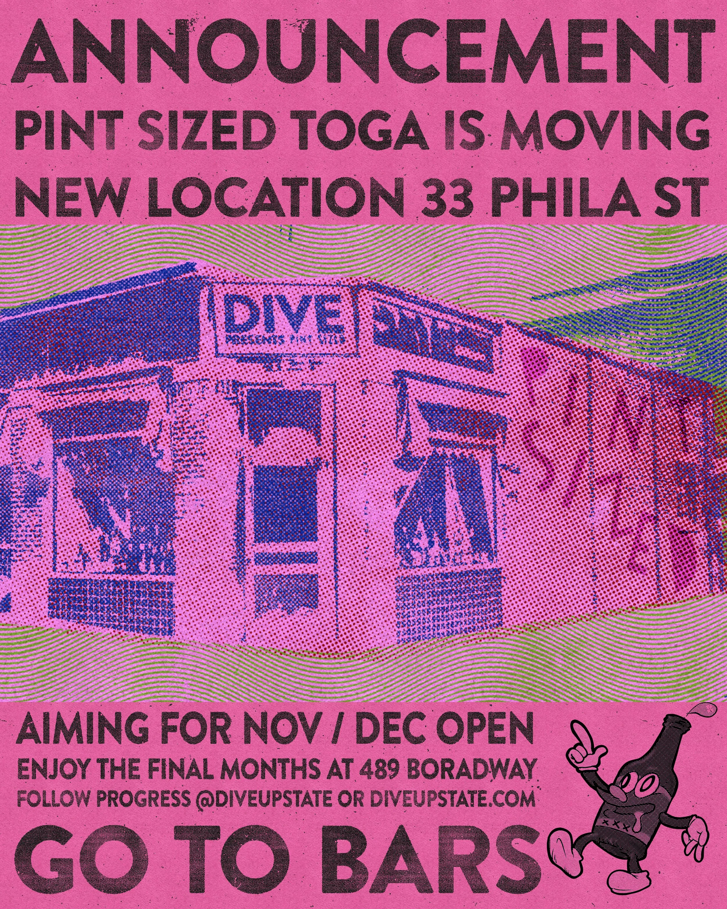BARS - We have two bars that lean on the divey side. One in Albany at 250 Lark Street. One in Saratoga Springs at 489 Broadway. They are called PINT SIZED. Our Saratoga location is moving to a much bigger and better location at 33 Phila Street sometime in November. We pride ourselves on authenticity, quick service and our massive selection. Our selection is the biggest and best it has ever been now with a full liquor license. While craft beer will always be a staple and we will continue to have the sickest beer list in downtown Albany and Saratoga Springs, we now offer well over 100 options with the addition of cocktails, shots, THC beverages, low calorie / budget items and more non alcoholic options than ever before.